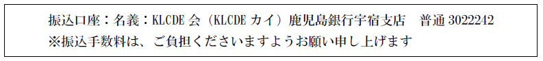 振込口座:名義:KLCDE会(KLCDEカイ)鹿児島銀行宇宿支店 普通3022242